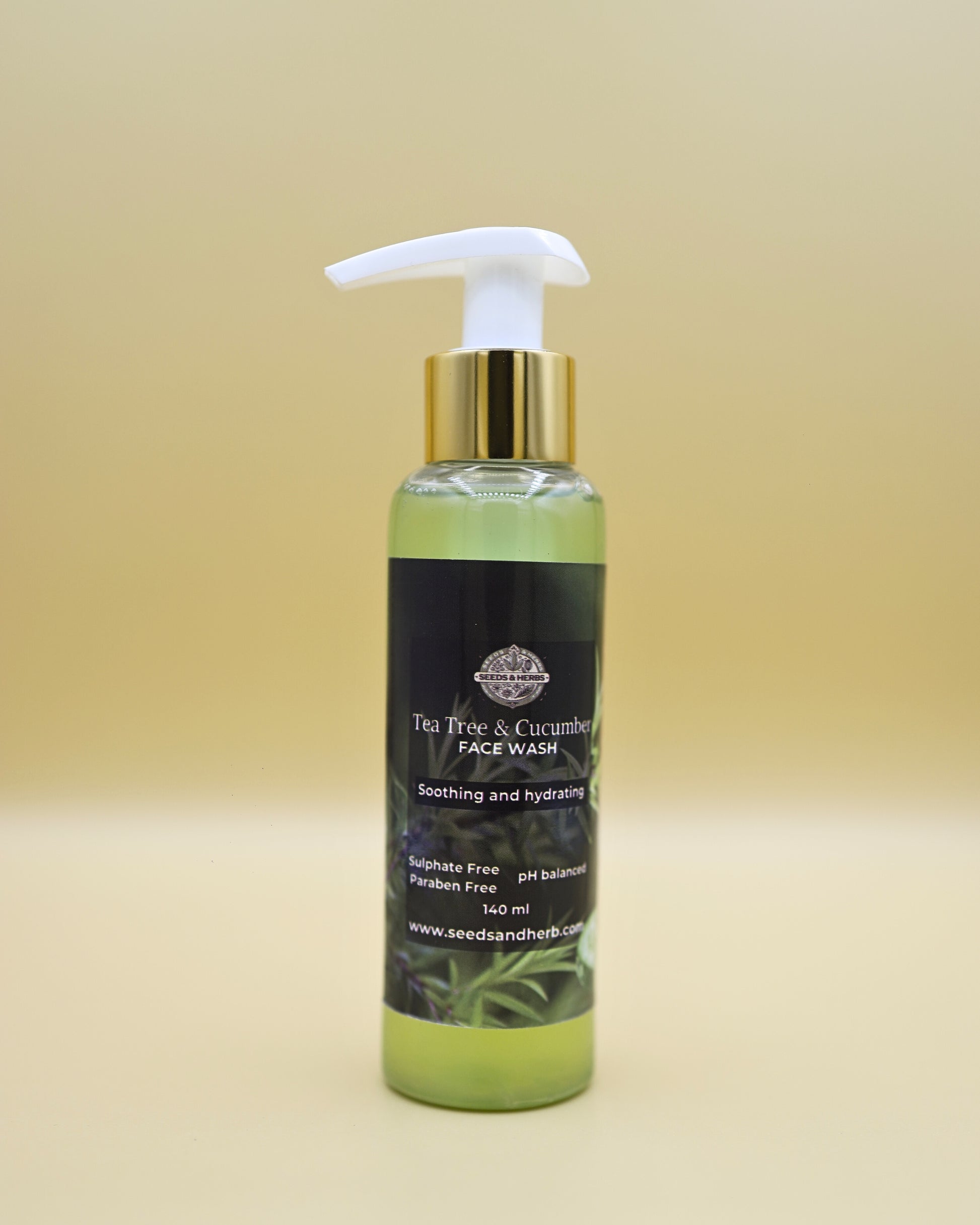 Calm, cleanse, and protect your skin with our refreshing Tea Tree & Cucumber Face Wash. This gentle yet effective formula is designed to fight acne, soothe irritation, and deeply hydrate your skin. Infused with tea tree essential oil and cooling cucumber extract, it helps tighten pores, reduce breakouts, and protect your skin from environmental stress.